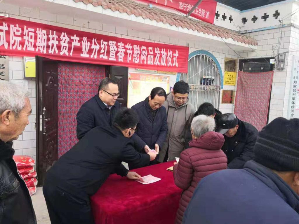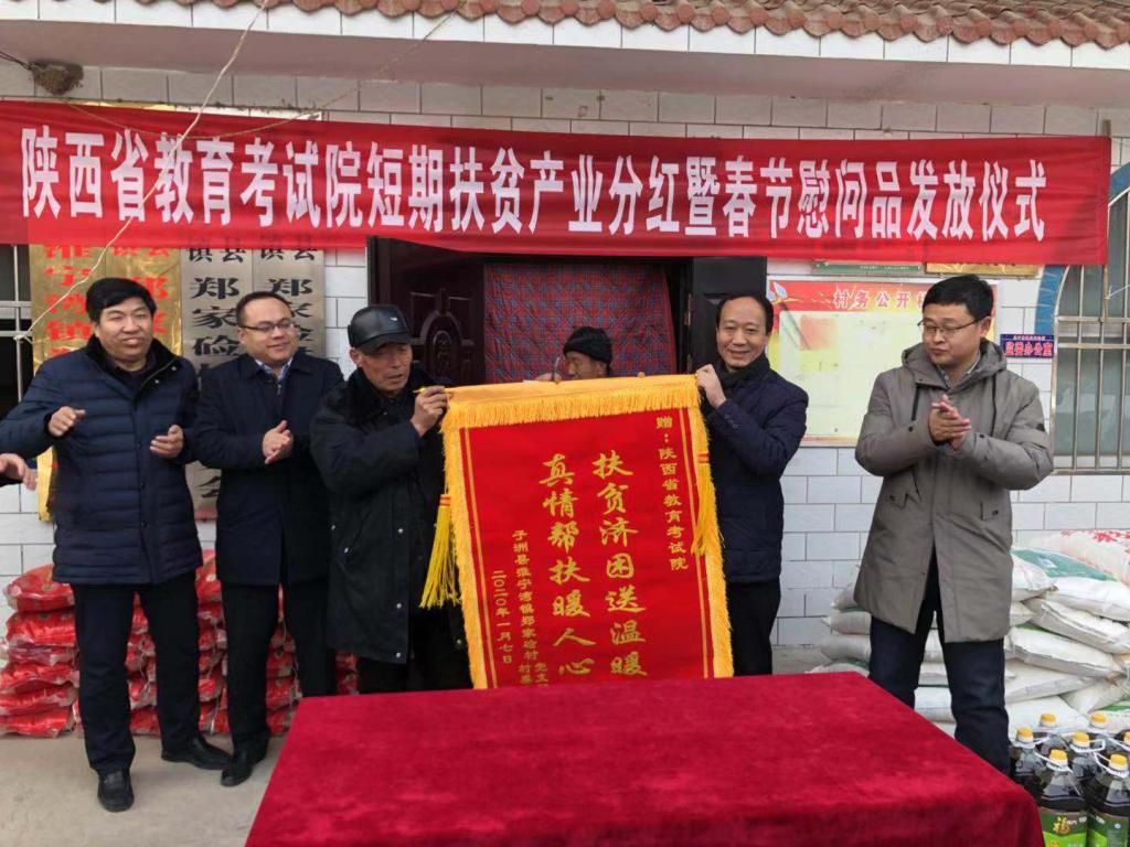 慰问组首先举行了短期扶贫产业分红暨春节慰问品发放仪式,向29户贫困户发放了山羊养殖项目的年度分红,以及米、面、油等春节慰问品。村支书郑世荣代表村两委向考试院赠送了锦旗,表达了感谢;朱征南院长鼓励贫苦户要对党和国家的政策有信心,牢固树立脱贫信念,积极参与集体产业,争取早日实现脱贫致富。