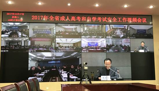 10月17日上午,为了贯彻落实教育部全国成人高考和自学考试安全工作视频会议精神和《陕西省国家教育考试安全工作方案》,我省组织召开了2017年陕西省成人高考和自学考试安全工作视频会议,就全省2017年成人高考和自学考试安全工作进行了安排部署。会议的主会场设在省国家教育考试考务指挥中心,分会场设在各市(区)国家教育考试考务指挥中心。