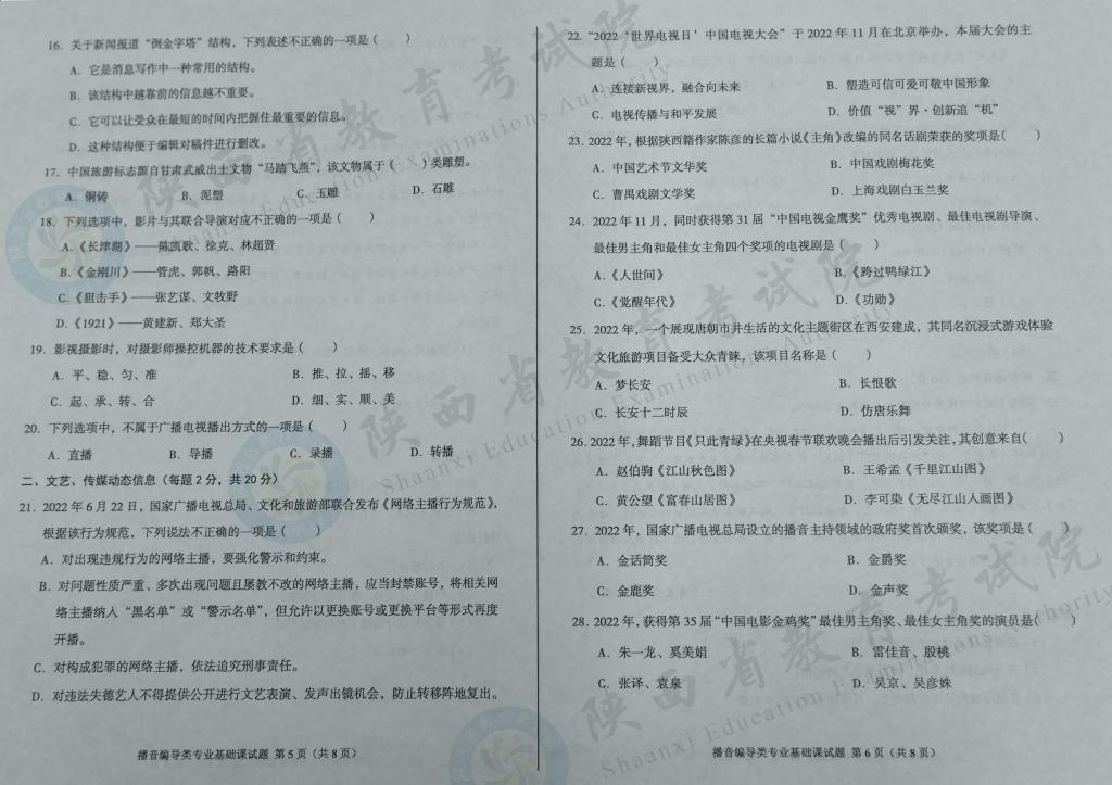 2023年陕西省普通高校招生艺术类专业课统考播音编导类专业基础课试题