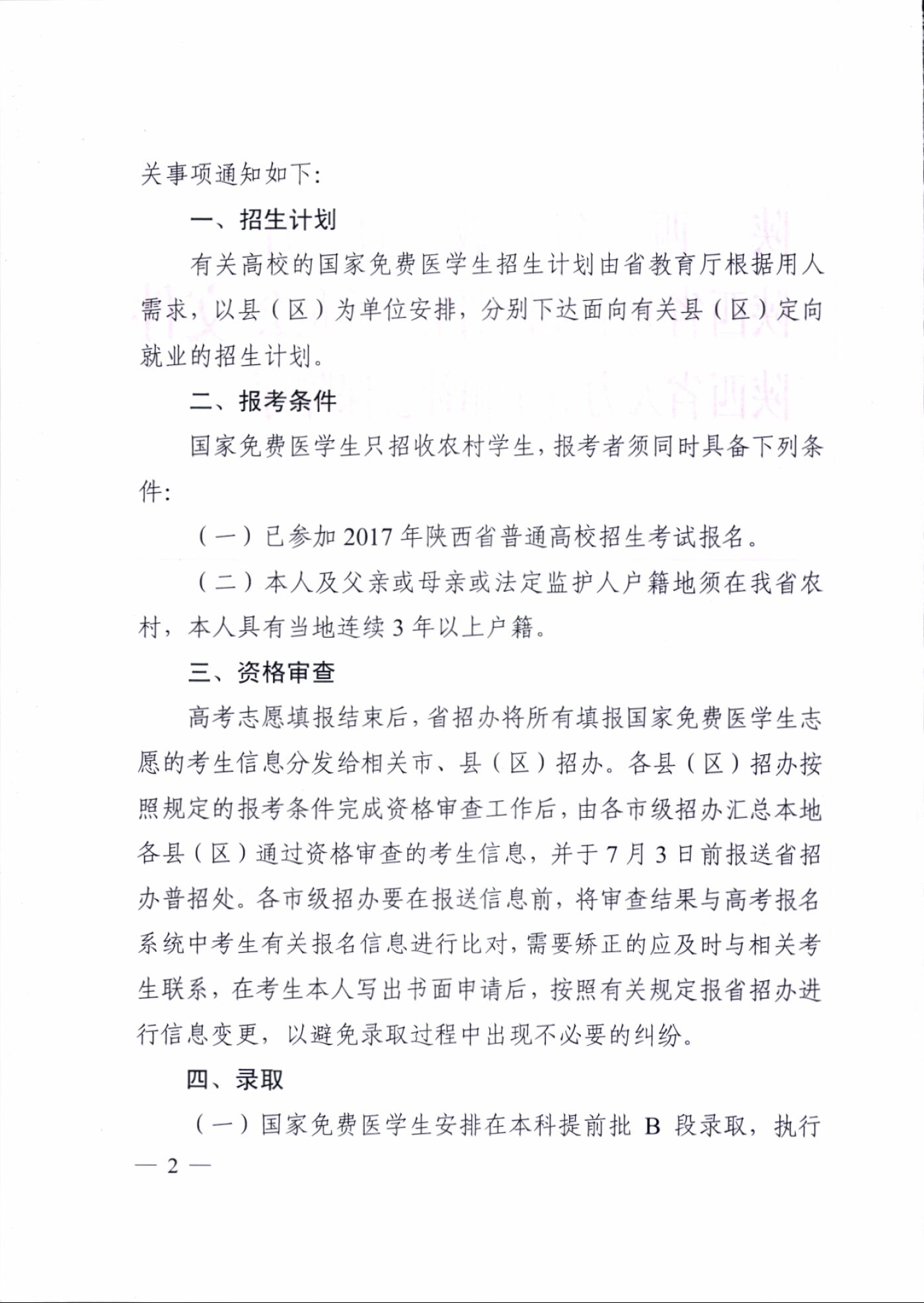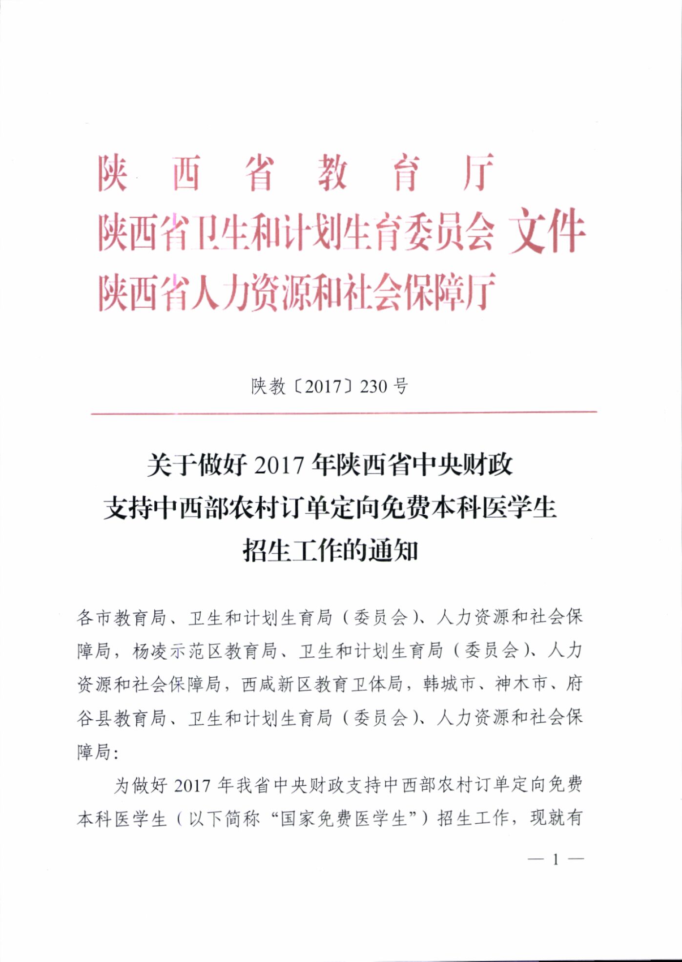 关于做好2017年陕西省中央财政支持中西部农村订单定向免费本科医学生招生工作的通知