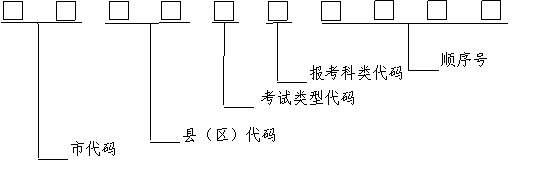 其中市、县(区)代码为报名点所在市、县(区)的代码,考试类型代码为8,报考科类代码为1。