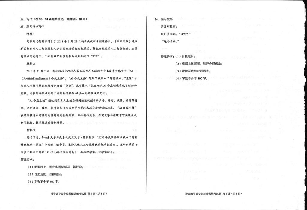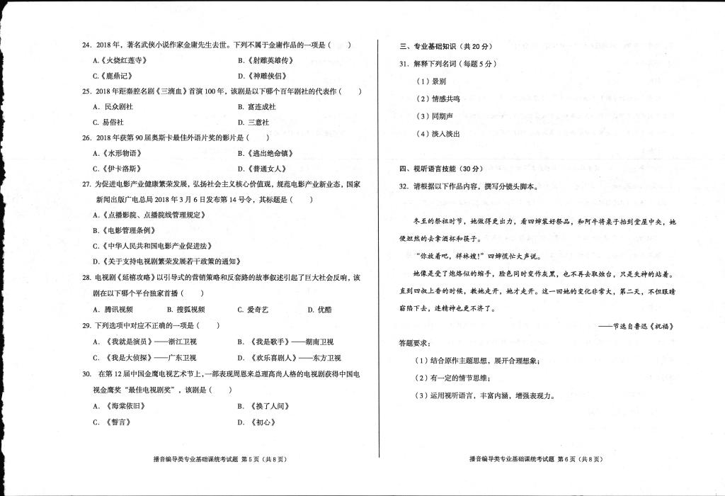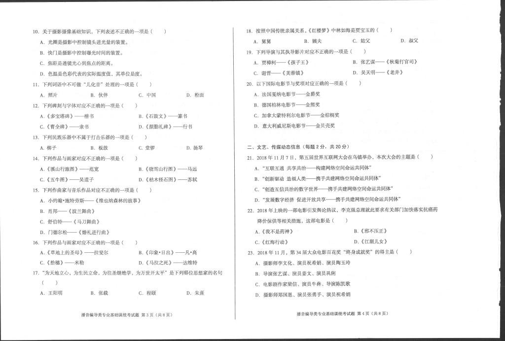 2019年陕西省普通高校艺术类招生播音编导类专业基础课笔试统考试题