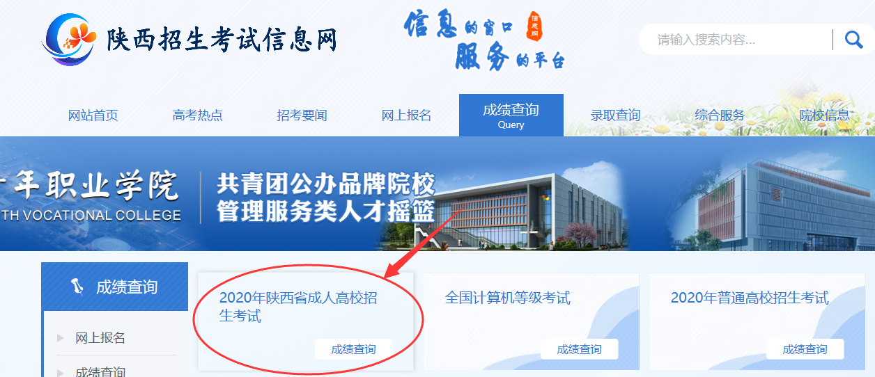 一、登录陕西招生考试信息网(http://www.sneac.com/),进入“成绩查询”栏目,在 “陕西省成人高校招生考生服务平台”,使用报名时所用的证件号码和密码登录后查询成绩。