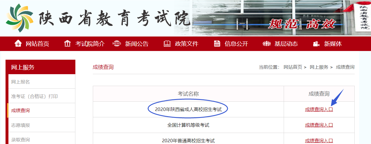 二、登录陕西省教育考试院网站(http://www.sneea.cn/),进入“成绩查询”栏目,点击“2020年陕西省成人高校招生考试成绩查询入口”,使用报名时所用的证件号码和密码登录后查询成绩。