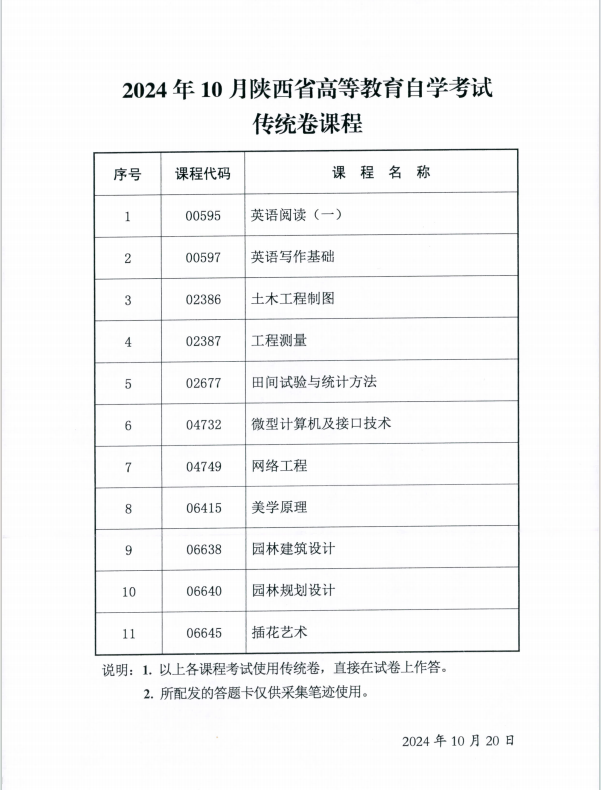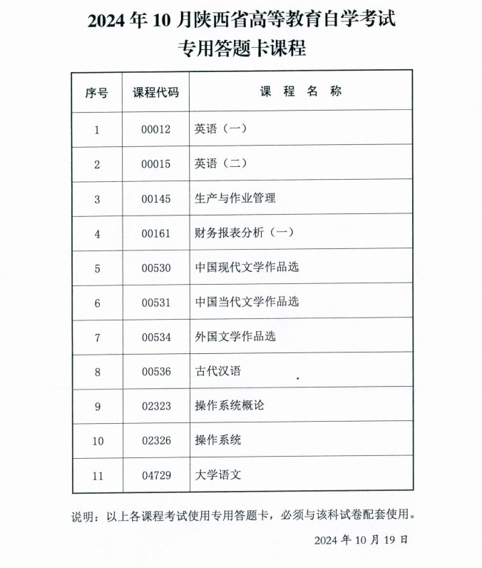 2024年10月陕西省高等教育自学考试专用答题卡课程、传统卷课程信息