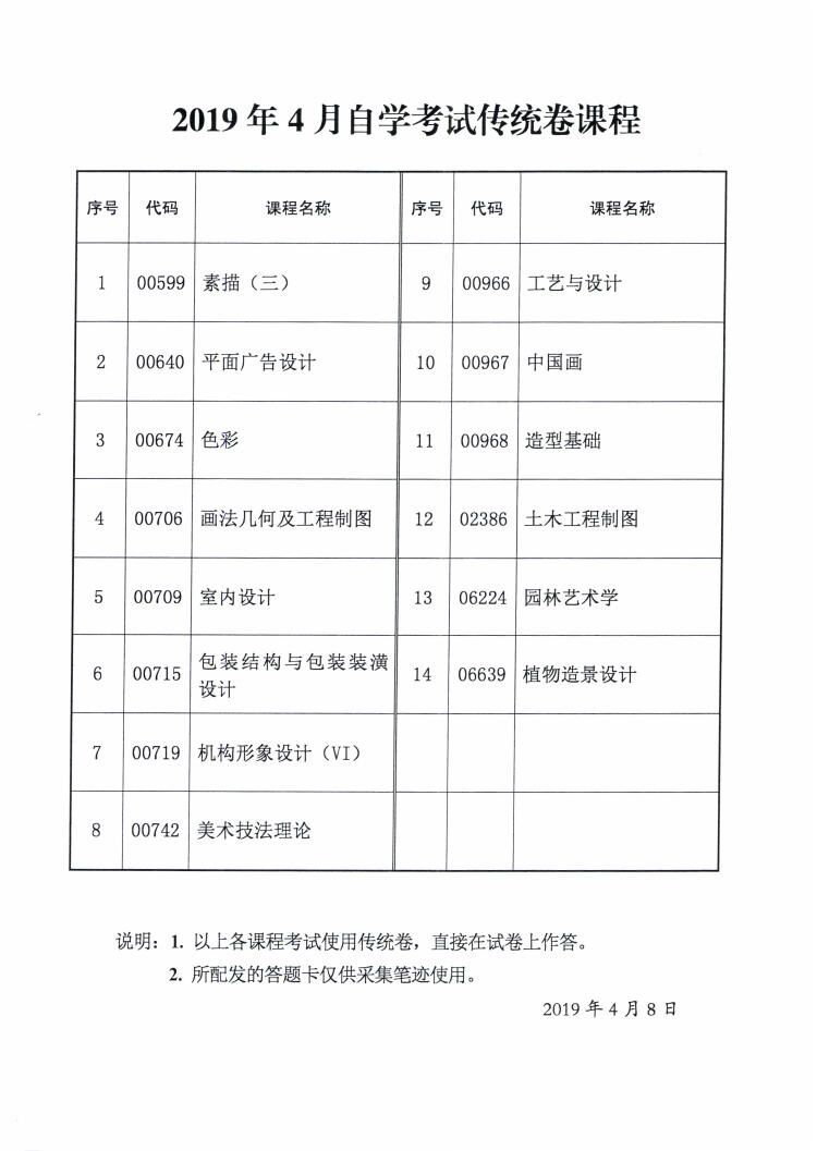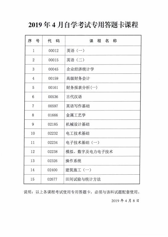 2019年4月自学考试传统卷课程、专用答题卡课程信息