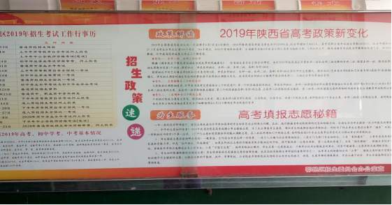 二是依托《鄠邑考试信息》为载体,全年共出刊六期。及时向基层学校宣传我省考试招生的新政策、新变化。充分利用区招办楼道橱窗制作写真展板宣传招生政策,让来我办办事咨询考生及家长一目了然熟悉各类考试报考程序规定。