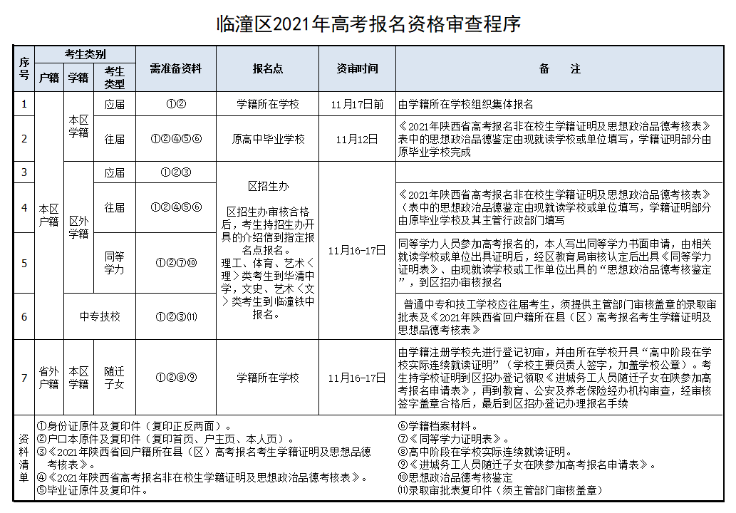 三、临潼户籍、区外学籍及同等学力等考生报名资格审查应交资料及报名流程: