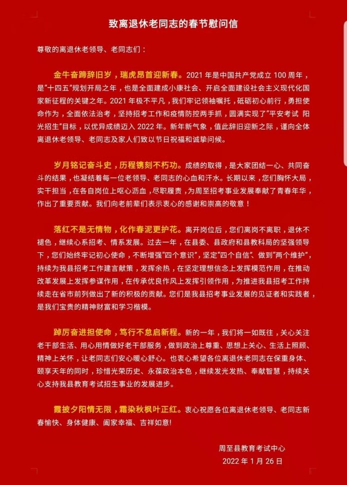 在新春佳节来临之际,我们精心制作美篇,配上春节序曲音乐,通过微信群向全体离退休老领导、老同志及其家人们致以新春的祝福和诚挚的问候,并送上慰问品,感谢老同志们一直以来对我县招考工作的关心和支持。
