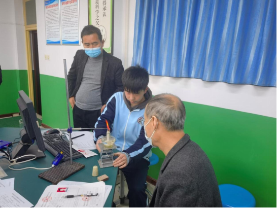 图为区考管中心主任郭宏让(左一)正在检查数字化实验操作考核