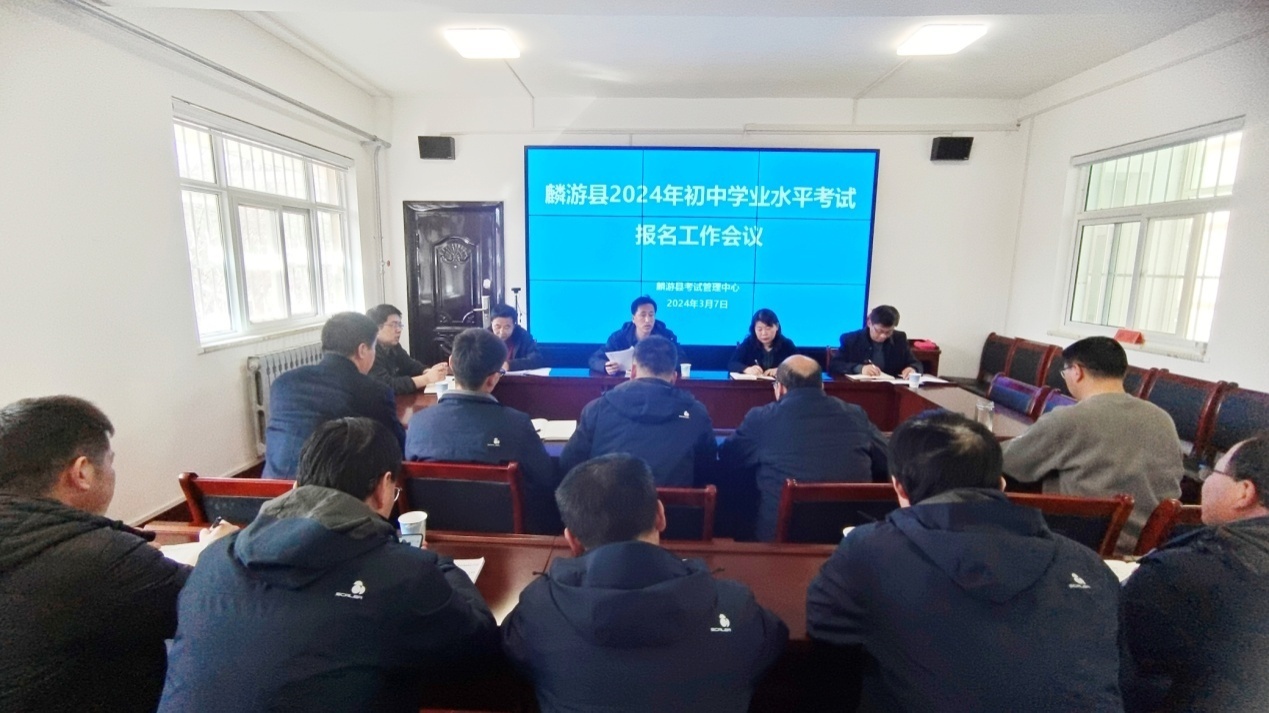 3月7日下午,宝鸡市麟游县召开会议全面安排部署2024年初中学业水平考试报名工作。县教育体育局副局长王勇出席会议并讲话,县教育体育局教育股股长、各初中学校分管校长、教务主任、业务主管干部和县考试管理中心全体人员参加了会议。会议由县考试管理中心副主任刘文学主持。