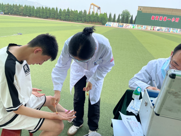 图为医务人员对参加考试后身体不适学生进行治疗、心理疏导