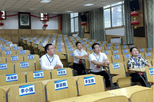 图为陈仓区区委书记马霄(左一)、宣传部部长徐宏刚(右二)、人大副主席闫海艳(右一)、区教体局局长李卫东(左二)在虢镇中学考点检查高考工作