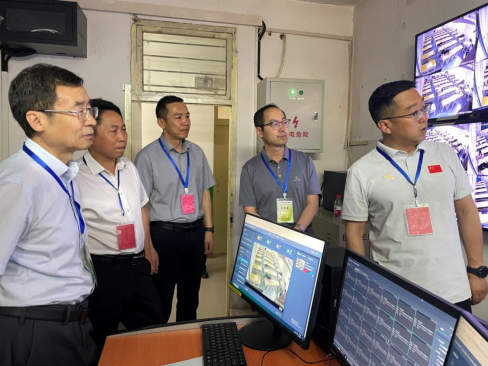 图为6月7日,宝鸡市教育局副局长王建昌(左一)、陈仓区副区长齐晓辉(右一)在虢镇初中监控室检查指导高考工作
