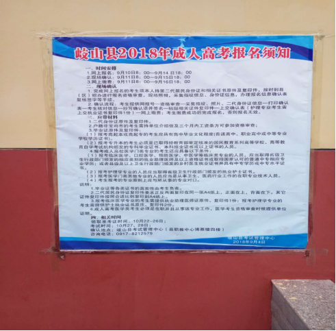 一是加大宣传力度。制作了《岐山县2018年成人高考报名须知》宣传版面,并充分利用“岐山招生考试”微信公众号,对报名时间、地点、携带资料以及相关政策等进行了广泛宣传,为考生报名提供了极大方便。同时,向每位报名考生下发省招办《2018年成人高考温馨提示》,宣讲考试纪律,帮助考生树立“诚信考试光荣,违纪作弊可耻”的思想,自觉遵守考试纪律规定和国家法律。