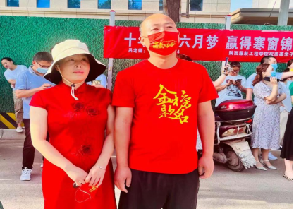 在考点门口,不少老师、家长身着盛装,为考生们加油打气。