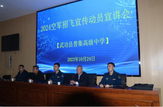 10月24日空军招飞局兰州选拔中心招飞人员在武功县考试管理中心的配合下,走进咸阳市武功普集高中、逸夫中学等高初中开展2024年度空军招飞宣讲活动,共宣讲4场次,师生三百余人参加了此次活动。武功县高度重视空军招收飞行员工作,积极参与,广泛宣传。武功县普集高中连续多年为空军招飞推送优质学生,并被颁发"空军招飞优质生源中学"荣誉牌。