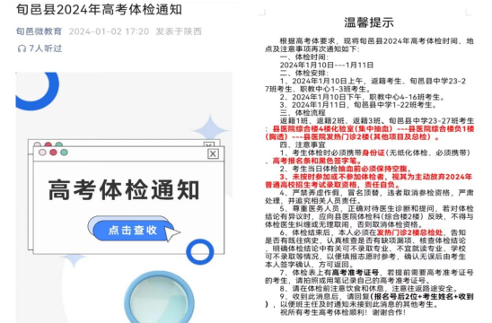 会前,县考试管理中心积极与县医院及体检公司沟通协调,确定体检时间、人员及流程安排,成立了精干的体检团队,制定了严格的工作实施预案与体检流程。在旬邑微教育、班级群等平台提前发布2024年高考体检公告,体检前一天向考生发布温馨提示,确保高考体检工作能够如期、顺利进行。
