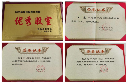 会上,教育局局长朱枰虎同志总结2023年教育工作,安排部署2024年教育工作,表彰了2023年度教育工作先进集体及个人。咸阳市武功县考试管理中心被评为“2023年度目标责任考核优秀股室”;王龙同志被评为“2023年度考核先进个人”;陈飞平同志被评为“2023年度教育宣传先进工作者”;赵亚政同志被评为“优秀信息员”。虽然我们考试管理中心硕果累累,但是与兄弟股室相比还应继续奋勇争先,为教育考试再添新功。
