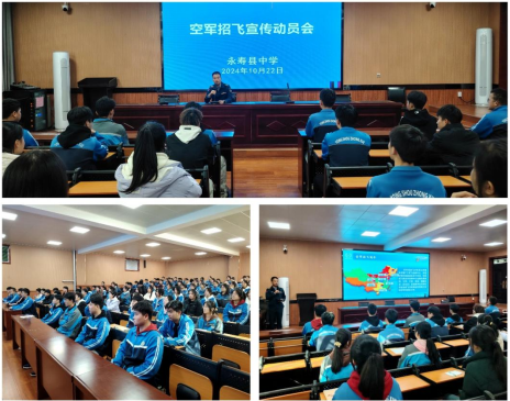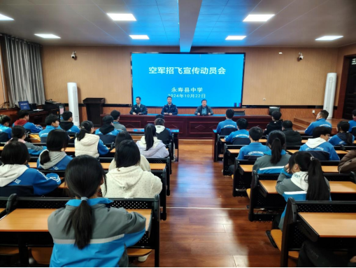 10月22日,空军招飞局兰州选拔中心一行莅临咸阳市永寿县中学,开展了以“为国奋飞 青春无悔”为主题的空军招飞宣传动员活动。学校有意向报考空军飞行员的2025届高三学生参加了此次活动。