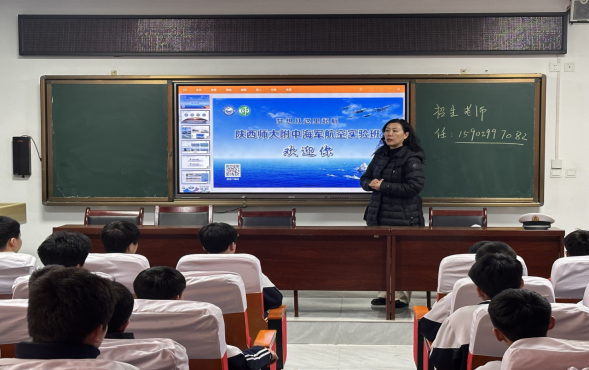 11月17日下午,海军招飞局齐教官和陕师大附中海军航空实验班任老师一行莅临礼泉县英才初中北校区和礼泉县实验初中,开展海军青少年航空学校招飞宣讲活动。有意向的初三学子怀揣海空梦想踊跃参与,现场氛围热烈。宣讲会上,招飞领导为同学们现场放映了精彩的海军招飞宣传片,结合海军发展历程与航空实验班培养特色,用震撼的航母飞行影像、详实的政策解读点燃学子热情。从招飞基本条件、报名时间及方式、招生程序、选拔流程到航空班教育管理、待遇保障,再到飞行员职业发展与家国使命等逐一解答同学们的疑问,并亲切交流,尤其强调“政治过硬、体魄强健、学业优良”的选拔标准,鼓励同学们以青春之名赴强国之约,积极报考海军青少年航空学校。