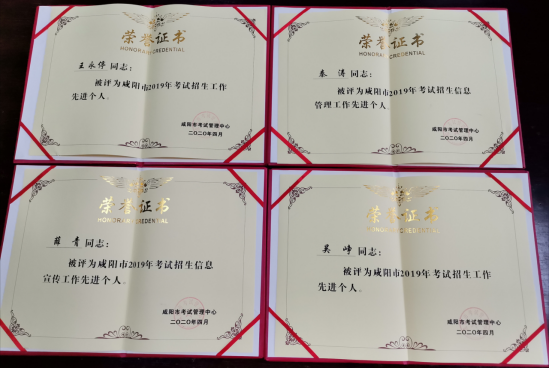 近日咸阳市考试管理中心召开的2020年全市考试招生工作表彰会上,渭城区招生办荣获咸阳市2019年考试招生综合考核“先进集体”、咸阳市2019年社会考试考务组织工作“先进集体”称号。王永停、吴峥同志被评为“咸阳市2019年考试招生工作先进个人”,秦涛同志被评为“咸阳市2019年考试招生信息管理工作先进个人”,薛青同志被评为“咸阳市2019年考试招生信息宣传工作先进个人”。