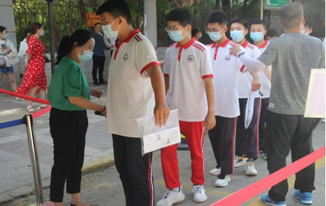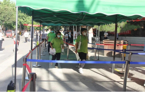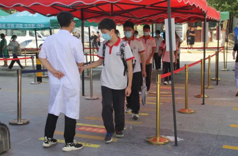 考点内外的工作人员已经全部就位,考生们保持一米间距,经过消毒、金属探测仪、体温检测后佩戴好口罩有序进入考场。
