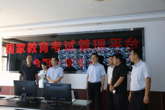 邓宽社一行实地查看了合阳中学考点智能安检门、教育考试管理平台、视频监控室、听力播放室、考务办公室等重点部位,详细了解考场布置和设施设备保障情况,对考前各项工作的精心准备、细致安排表示肯定。