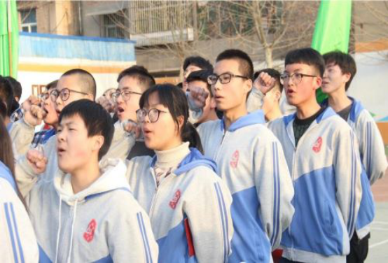 中考前誓师大会上,学生们宣誓时的样子