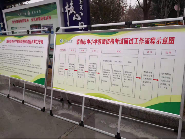 1月5日下午,为期两天的渭南市2019下半年教师资格面试圆满结束。2960名考生经过候考、抽题、备课、上课、答辩等环节,顺利完成了学前、小学、初中和高中四个学段37个学科的考试。渭南市教育局、渭南市考试管理中心、临渭区教育局、临渭区招生办等部门干部、面试考官以及考点工作人员400余人为考试提供专业和综合保障。考试期间,渭南市教育局局长党福奎深入考点巡考,市纪委派驻市教育局纪检督查组全程督查考风考纪执行情况。