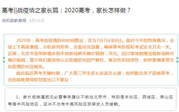 在疫情防控非常之时,合阳县教育局及时发出《致广大考生的一封信》《2020高考,家长怎样做?》等温馨提示,给家长和考生提出指导性建议,为考生加油鼓劲,提醒考生在高考时应该注意的相关事宜,祝愿广大考生在人生的重要转折点上,全力以赴,昂扬斗志,攀峰斩浪,取得理想成绩。同时向市民发出“夜间在小区和楼道放轻脚步,给考生提供安静的睡眠环境;在学校及周边人不吵闹、车不鸣笛;高考期间,尽量步行绿色出行”等倡议,为高考营造良好环境氛围。