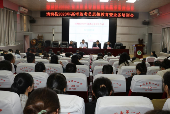 5月28日上午九点,在第一小学会议室举行了2023年榆林市清涧县高考监考思想教育暨业务培训会。县教体局副局长惠东平、招生考试中心主任白贺锋、工会主席高峰、信息技术组组长康停停及全体监考员参加了会议。