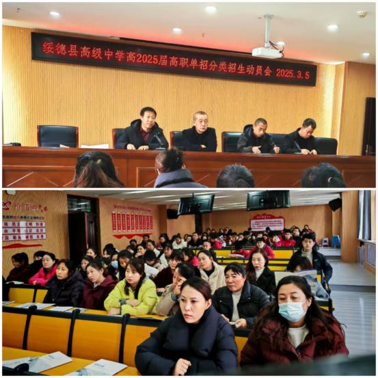 为做好2025年陕西省高职院校分类考试工作,帮助考生更好地了解陕西省高职院校分类考试政策,指导考生明晰未来升学途径,寻觅多元化的升学路径。3月5日,榆林市绥德县招生考试中心在绥德县高级中学召开了2025年陕西省高职院校分类考试宣传动员会。