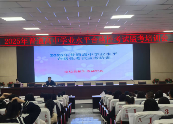 为确保2025年普通高中学业水平合格性考试笔试平稳有序进行,榆林市定边县招生考试中心于2025年5月7日下午在定边县第二中学报告厅组织召开监考培训会。会议由定边县招生考试中心副主任栾小军主持,全体监考教师参加培训。