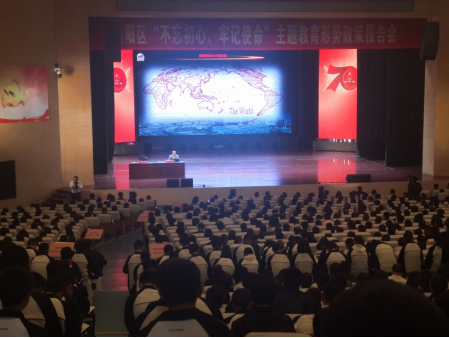 9月29日下午,榆林市榆阳区招生考试中心全体干部在榆林市第一中学参加了由中共榆阳区委组织部、榆阳区教育与体育局主办的“不忘初心、牢记使命”主题教育形势政策报告会,报告会由区委常委、组织部长万勇主持,特邀国防大学金一南教授主讲。金教授深入浅出地讲述了中美贸易战的起因、香港的当前形势以及中国一些优秀企业家的创业史,现场不时响起阵阵掌声。