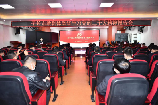 为深入学习宣传贯彻党的二十大精神,落实立德树人根本任务,办好人民满意的教育,2022年11月10日,延安市子长市教育科技体育局党委组织召开了教科体系统学习贯彻党的二十大精神报告会。市委党校讲师杨盼盼应邀作了专题报告。各党(总)支部书记、教科体局全体领导干部,局属单位主要领导,中小学校长、幼儿园园长到场聆听了报告。市教科体局党委专职副书记强军阳主持宣讲会。