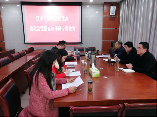 近日,汉中市南郑区招生办召开了“讲政治、敢担当、改作风”专题教育学习会,全体党员干部参加了会议。会议传达了南郑区委、区教体局 “讲政治、敢担当、改作风”专题会议精神,组织学习了习近平总书记对加强党的作风建设作出的重要指示、《中国共产党纪律处分条例》等文件。