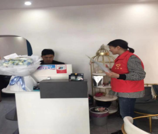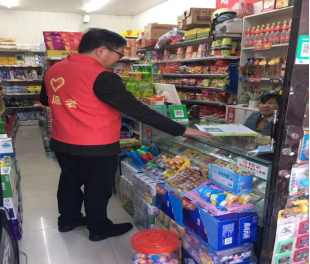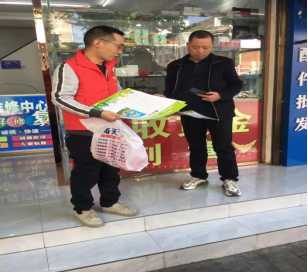 (图为印制的倡议书以及志愿者们深入商户进行宣传和讲解)