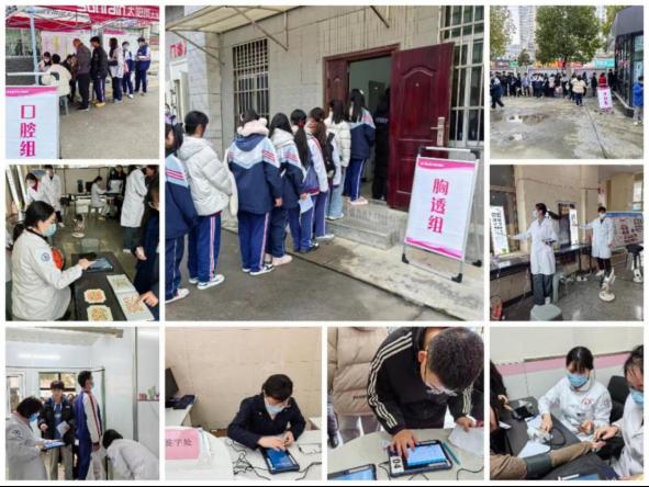 你看那边,学校正组织学生按班分组有序进到医院,然后分成若干个小组分散到各个体检项目处,依次排队安静有序等待体检。医生正耐心细致进行检查,对学生提出疑问一一解答,并给学生提出一些生活方面的小建议。