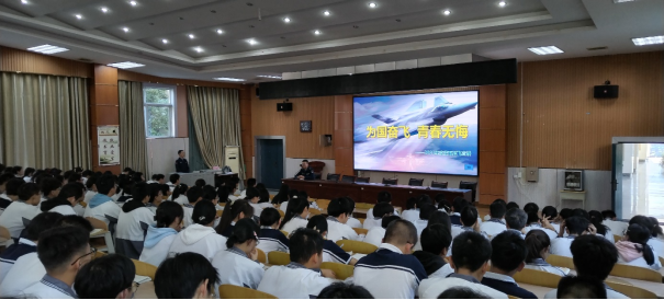 汉阴中学阶梯教室座无虚席,大家都在认真观看空军招飞宣传片,并不时做着笔记。