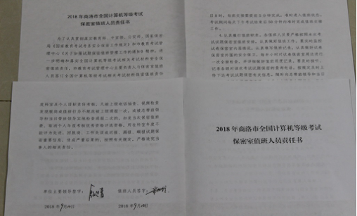 一是强化保密培训,夯实保密责任。9月12日上午组织保密人员认真学习《国家教育考试考务安全保密规定》和《全国计算机等级考试安全保密工作要求》,与每名值班人员签订了责任书。保密室实行每天3人24小时值班,严格值班纪律,详细记录值班情况,实时监控保密室内外情况,公安人员随时检查保密室和周边治安情况,做好保密室外围安全保卫工作,确保涉考资料安全。