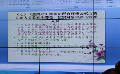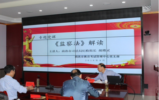 为了进一步促进党员干部作风排查整改的实效性,近日,商洛市教育考试管理中心聘请了商洛市纪委驻市司法局纪检组组长胡增灵给全体党员干部讲了以《监察法》解读----全面学习贯彻监察法,争做尊法学法守法践行者》为题的主题党课。课程内容结合考试招生工作性质,从“深刻认识制定国家监察法的重大意义、监察法的主要内容、监察法的六大焦点、迅速掀起《监察法》学习宣传贯彻工作”等四个方面进行了《监察法》解读和学习辅导。