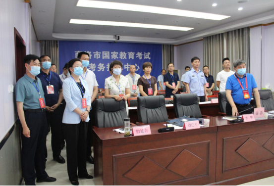 郭永红(左三)在市国家教育考试考务指挥中心检查全市开考情况