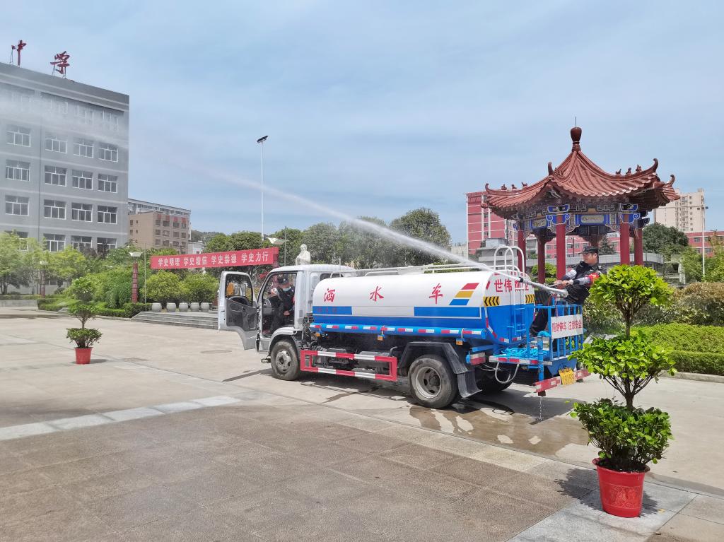 二是定期喷淋降温。考试期间,开放校园喷泉和花园喷淋系统;洒水车每天四次喷洒校园,为考点降温增湿。